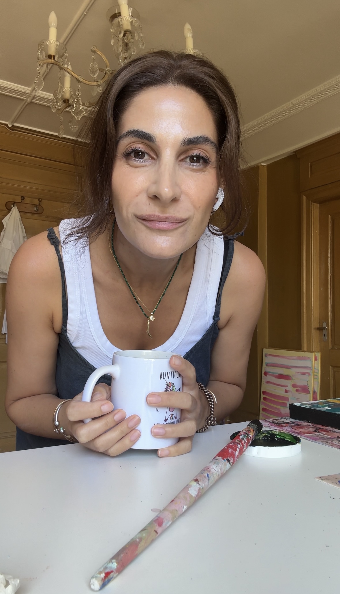 Dans son atelier, qui est un espace d’inspiration et de liberté, elle crée des peintures abstraites et des tableaux plus petits porteurs de messages.